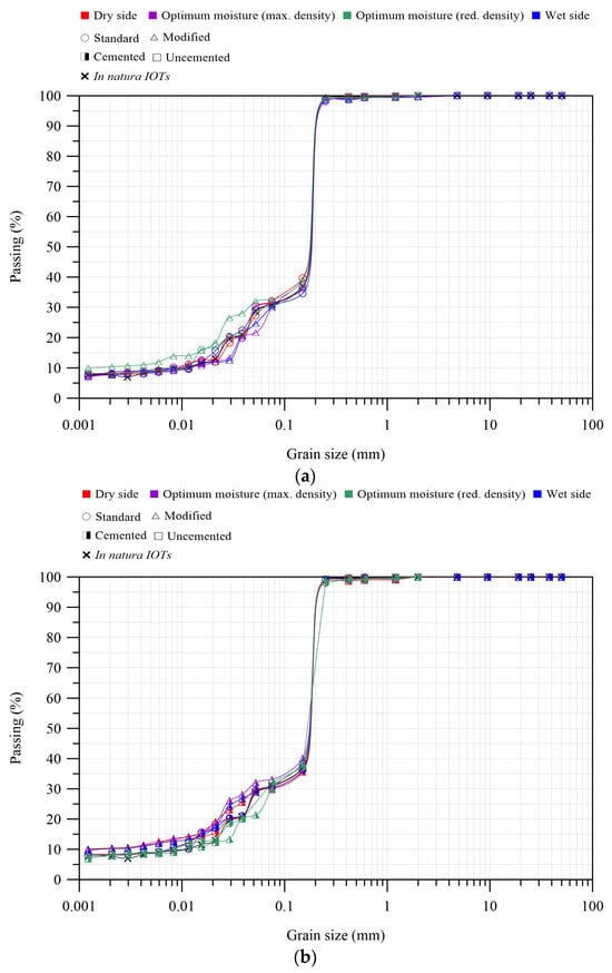 Grain size distribution test conducted after the one-dimensional compression test: (a) uncemented and (b) cemented.