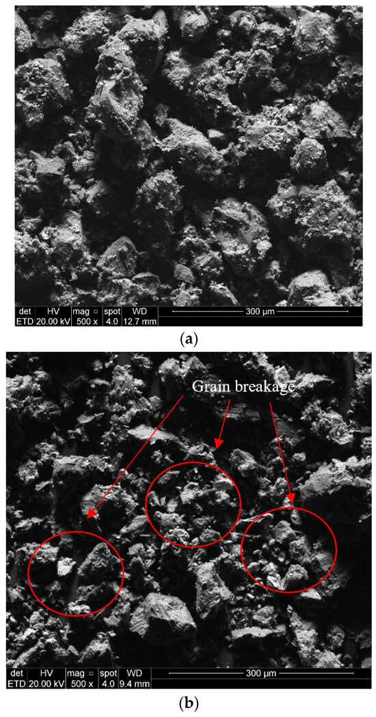 SEM micrographs after triaxial testing at 500× magnification rate: (a) M_D_0C and (b) M_D_3C. Red circles and arrows represent the grain breakage of the samples.