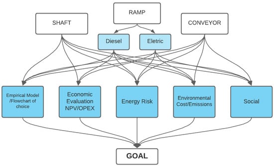 Considering the possibility of different criteria in different spheres for the selection of underground mine access type and transportation route, such as the problem of selecting the mining method, the AHP technique can be applied to consider different criteria in the decision-making process. Furthermore, it enables the integration of the ESG approach into the decision-making process. In this way, multicriteria analyses, particularly the hierarchical methodology, can evaluate non-stochastic criteria. When applying the AHP method to assess the relative importance of items, weights are assigned based on the understanding of their relevance. For instance, a company with a need for positioning in a zone or scope where sustainability is a significant factor will tend to assign greater weight to items related to emissions/environmental costs compared to another company operating in a short-term scope or where these factors are not considered relevant. The following figure (Figure 2) represents the structure of a multicriteria analysis for the choice of mine access based on different criteria, considering the options: ore hoisting via a vertical shaft, transport through a spiral ramp with electric or diesel trucks, and the use of an inclined belt conveyor (decline).