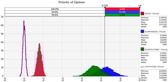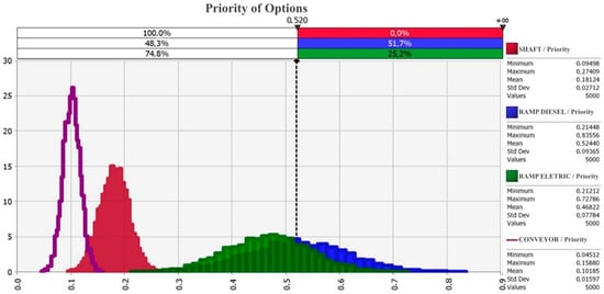 Figure 4 presents the priorities of the access/transport options obtained from the execution of the Monte Carlo simulation by a triangular distribution. It is evident that the option of a ramp for diesel trucks remains the global priority. Similar to the results from the normal distribution, scenarios are observed where the option for electric trucks presents a higher priority than the others. It is evident that the distributions of scenarios between the options for diesel and electric trucks partially overlap.