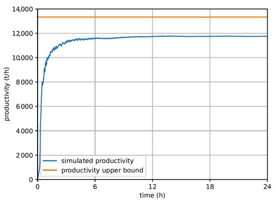 dumping sites, loading sites, truck models, dumping time , given in Table 1, loading time in Table 2, truck speed v, given in Table 3, truck load L, given in Table 4, and a fully available truck number . These data were obtained from 7 months of real operation in the Pico mine in Brazil, where the truck models were, respectively, CAT-785C and CAT-789D. Pico is a mine in Itabirito city, in the state of Minas Gerais in Brazil, which has been in operation since 1942 with a processed iron ore production capacity of 22Mt/year. Notice from Figure 3 that one day of simulation is enough for a long-term productivity estimation (actually, the productivity looks steady after 12 h of model simulation), and also that the simulated productivity is never larger than the upper bound. The gap between the simulated steady state productivity and its upper bound is mostly explained by the heterogeneous fleet, in particular, due to the difference in the load capacity between the two truck models. A queue priority for more productive models would make the gap smaller, but this is beyond the scope of this paper and could be a research theme for further investigation. The next section shows a homogeneous fleet simulation, which leads to much tighter gaps.