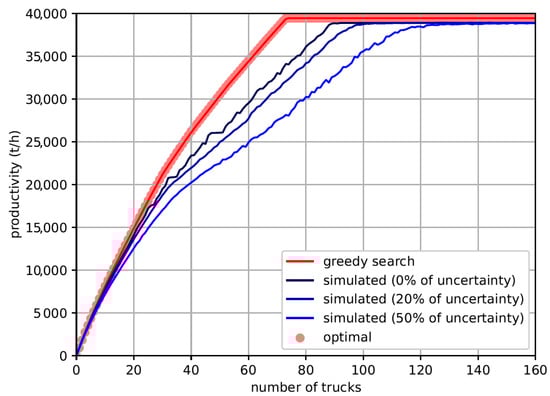 Figure 4 shows the increase in mine productivity with the number of available CAT-789D trucks until a saturation point is reached, where more trucks will only generate queues. This case study considers the distance (10) between dumping sites and loading sites, as well as the parameters in Table 1, Table 2, Table 3 and Table 4 for truck model 2 (i.e., CAT-789D). Notice that the greedy search solution matches the optimal solution, which is typical, but does not always happen (sometimes the greedy search productivity is a little smaller just before the saturation point). This quantifies the optimality of the greedy search. Notice from Figure 4 and Figure 5 that the simulated productivity, which is a feasible realization of trucks in the mine, starts close to the optimal productivity upper bound given by the solution of (5)–(9), gradually becoming smaller than the upper bound because of queues as the number of trucks increases. The simulated productivity ends close to the upper bound again (with a gap inferior to ), as the number of trucks is large enough to occupy all loading and dumping services without gaps. This quantifies the optimality of the dispatch rule and also quantifies how tight the upper bound can be. Finally, notice also that greater uncertainty in the simulation leads to lower productivity due to unforeseen queues, whose gap becomes smaller as the number of trucks gets further from the saturation point. For 50% of the uncertainty (i.e., triangular distribution with mean , minimum and maximum ), the gap between the simulated productivity and its upper bound can become as large as . Finally, notice that as the number of trucks gets large enough, all simulated productivity tends toward the upper bound (curiously, all with a relative error about ), no matter what the uncertainty involved is and so does the greedy search solution. This result shows how robust to uncertainty the proposed dispatch rule is, as well as how optimal the greedy search solution is. These results are depicted in detail and obtained for more mine instances in the next section.