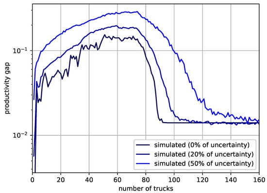 The mine’s realized productivity gap to the upper bound as a function of the number of trucks available in the mine. Models with uncertainty consider the average productivity of 30 runs using symmetric triangular distributions with the mean at , whose minimum and maximum values are at and respectively.