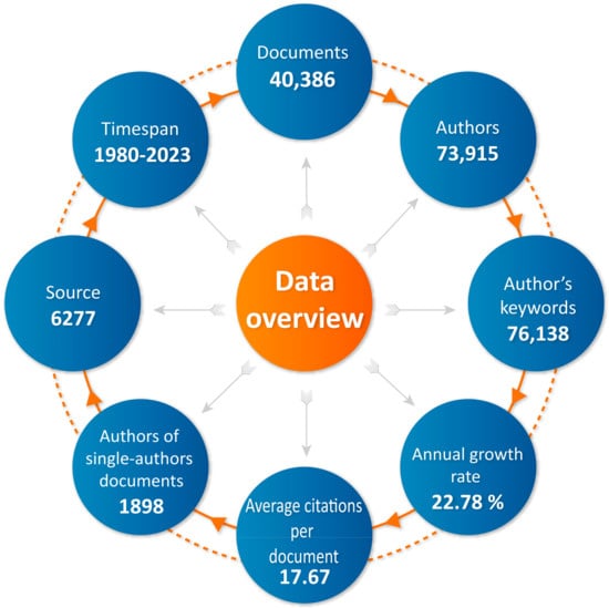 After the removal of duplicate results using R Studio to identify and eliminate redundant entries, we successfully obtained a final set of 40,386 (Figure 2) unique references within the field of mine closure and ecological reclamation, acquired following the consolidation of data from WoS and Scopus, alongside other necessary preprocessing steps. The compiled data was then stored in an Excel file.