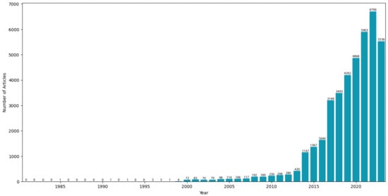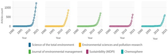 Looking over the statistics on the number of publications each year provides an illuminating insight into the research process related to mine closure and ecological reclamation. Over the period from 1980 to 2023, a marked trend emerged from these data (Figure 3), a steady growth in the number of publications, reflecting a growing interest in the fields of mine closure and ecological reclamation. During the first part of this period, from 1980 to 2004, the number of articles published was relatively modest, with less than 100 publications per year all over the world, representing 23% of the total number of articles during this time range. This can be described as an ‘initial phase’ characterized by a gradual increase in the number of published articles. Then, from 2004 to 2013, we observed a significant increase, from 114 to 420 per year. This is indicative of a period when research into mine closure and ecological reclamation gained in importance. As scientists contributed to this field, crucial issues such as environmental policies, ecological reclamation principles, phytotechnologies, and other aspects became more relevant, generating notable interdisciplinarity. After 2013, the growth in publication frequency in the field of mine closure and ecological reclamation continued substantially, reaching a total of 6705 articles in 2022. This significant increase testifies to the growing importance attached to these issues within the scientific community.