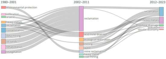Thematic trends are identified by the frequency change of the keywords, as shown in Figure 7. The colored squares indicate that the keywords appeared more frequently in that period. From 1980 to 2001, heavy metals, contamination, rehabilitation, and revegetation were the hot keywords. This indicates a surge in research concerning the environmental consequences of mining operations, with a specific emphasis on the enduring effects of abandoned mining sites.