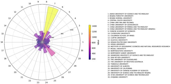 Figure 9 serves as a visual representation of the leading global institutions in terms of their scientific publications in the field of study. Notably, the most prominent authors are predominantly affiliated with key institutions, with the China University of Mining and Technology leading the pack with 1439 articles. Other significant contributors include the University of Chinese Academy of Sciences (677 articles), the China University of Geosciences (491 articles), the University of Alberta (445 articles), and the Chinese Academy of Sciences (444 articles), as presented in Figure 9.