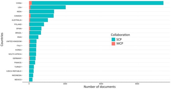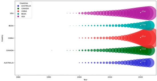 The analysis of single-country populations (SCP) and multiple-country populations (MCP) offers a deeper insight into a country’s scientific research capabilities. Over the study period (1980–2023), China emerged as a frontrunner with the highest MCP, totaling 225 articles, and the highest SCP, encompassing 10,957 articles. In contrast, Canada exhibited a slightly higher MCP (127) compared to the USA (108), as indicated in Figure 11. This dichotomy implies that Chinese and Canadian researchers actively engaged in international collaborations, while their American counterparts predominantly pursued independent research efforts.