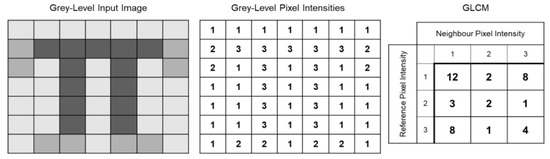 In order to construct the GLCM with its elements (Pi,j), the number of times when a pair of pixels with grey levels i and j appear next to each other is recorded. An example is provided in Figure 1 [26]. The grey level input image (on the left side of Figure 1) consists of three grey levels, 1, 2 and 3. The corresponding intensity coded representation is shown in the middle. The GLCM for a 0° direction and a distance of one pixel is shown on the left side of the figure.