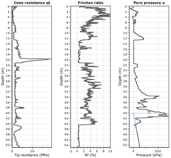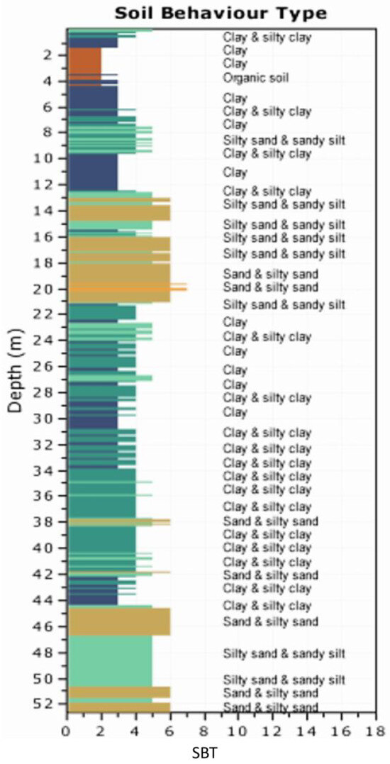 To perform the cone penetration test, a 10 cm2 subtraction cone was pushed into the ground at a constant and standardized rate. Simultaneously, the measurement of the ground resistance to the cone tip was measured, by dividing the total force acting on the cone by the projected area of the cone, as well as the friction along the friction sleeve of the cone and the dynamic pore pressure [10,27]. These parameters were recorded at 10 mm intervals as the cone penetrated the soil, generating a continuous soil profile (see Figure 3). The data obtained was analysed to derive the soil behaviour type (SBT) using the Robertson—Campanella chart [11], and the results are shown in Figure 4. While the SBT classification does not necessarily correspond to the soil type (since certain soils can behave like a different soil type), in most cases there is a very strong correlation between SBT and soil type. For this test, this was confirmed as additional soil borings were performed that showed that the SBT matched the soil type.