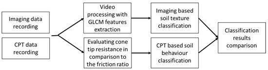 For this research input, verification data (video recordings during the CPT using a small digital camera installed in the cone and the CPT data, respectively) were collected simultaneously during the CPT sounding as shown in the research workflow (Figure 6). This ensures not only functionality of the data collection in an on-site environment, but also benefits the comparison and verification of the study.