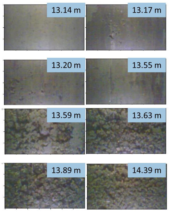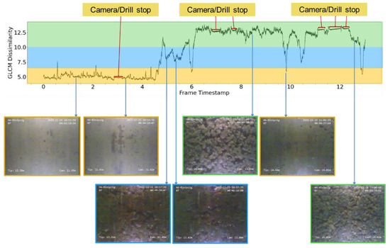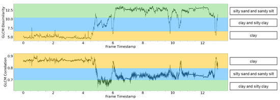 As seen in Figure 8, the difference between texture data is clearly visible. The frame denoting the camera depth of 13.14 m has the most regular texture among the clay frames, as does the frame at a depth of 13.59 m among the sand and clay frames. Clay images have small amounts of irregularity in texture, noted by high values of GLCM correlation, and different heterogeneity features noted by GLCM dissimilarity across all directions considered.