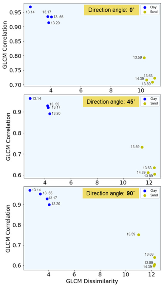 The GLCM dissimilarity and correlation features, along with their respective parameters, were identified as the most representative material indicators based on a series of tests. It was observed that certain features, such as GLCM homogeneity and energy, generated nearly identical results and plots to features mentioned before.