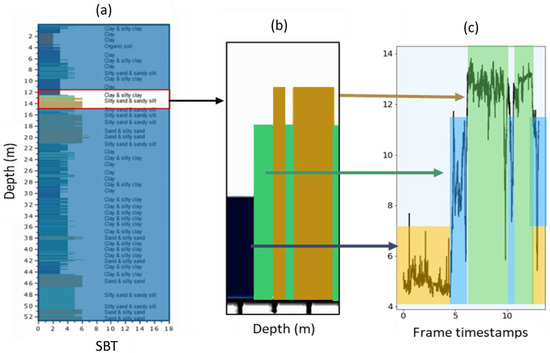 GLCM dissimilarity values correlated with soil type: (a) CPT based soil behaviour type; (b) CPT based SBT on the depth of interest (12–15 m); and (c) GLCM dissimilarity values on the depth of interest.