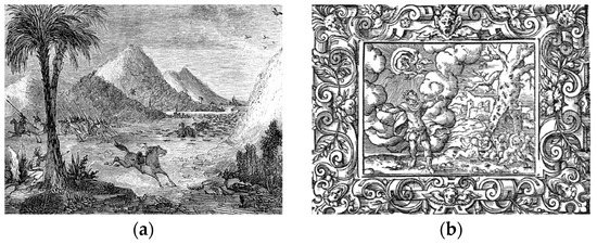 Herodotus mentions this mythical creature based on descriptions he gathered from the testimonies of various travelers. Thus, in his book “The History” [5,6], he mentions that gold seekers from northern India, particularly from Kaspatyro and the region of Paktiki, were searching for gold in the desert. To find the gold-bearing sands, they used the nests of some giant ants whose size is described as smaller than that of a dog but larger than that of a fox [5,6,32,33]. He also mentions that the king of the Persians had some of these animals, which built their nests like the common ants by raising the golden sand to the surface. The Indians search for these nests to find the gold, and after gettingg it, they run away from these huge ants, as represented in Figure 1a.