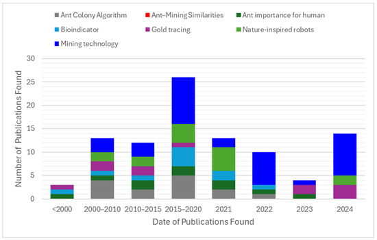 The research identified 122 different sources, of which 68% were full articles, 14% were abstracts or conference articles, 12% were online sources, and the remaining 6% were books, dissertations, or reports. Figure 5 below shows the distribution of these articles by year of publication and by the seven categories mentioned above. Most of the citations were found in the last decade, with the 2024 citations mainly concerning online sources and the most significant percentage concerning mining technologies and modern nature-inspired equipment.