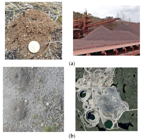 Comparison of: (a) ore deposits with ant nesting (personal photo); (b) comparison of surface open pit excavations in Diavik diamond mine (Google Earth) with ant nest entries (personal photo).