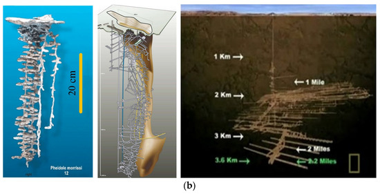 Ants create complex structures and a network of tunnels within surface soil materials with poor mechanical properties. Millions of years of evolution have led to perfection of the mining technique, providing them with the required stability. The intricate network of galleries is reconstructed using a technique in which: (1) abandoned nests are filled with either liquid metal or cement, (2) after solidification, the nest is excavated, and (3) the soil is removed, leaving the ant excavation system exposed. This technique has been used to produce a nest cast and in several published studies a digitized network of galleries is produced (Figure 10a) to determine their stability using 2D and 3D numerical models [56,57,58,59]. These studies help us to understand how ants have achieved the required stability of excavations in loose soil and can subsequently be applied to human operations. This technique allows conclusions to be drawn at the scale of human underground excavations, and it is a first-class analogue experimental solution without the need for complicated apparatus and analogue sandboxes [60]. The size of the ant colonies (relative to their size) exceeds even the deepest excavations, such as in the example of the Pyhiisalmi Mine in Finland, which is the deepest metal mine in Europe, with a depth of 1444 m [61]; and the Mponeng gold mine in South Africa [62], which has reached depths of over 3.6 km and is shown in comparison to the mold of an ant colony [4] in Figure 10b.
