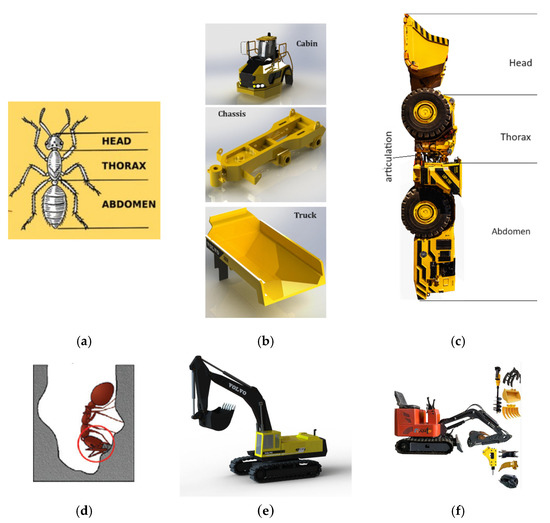 In addition, the body of the ant (Figure 11a) has inspired the creation of articulated vehicles, which makes them more flexible in movement, particularly in underground applications. Figure 11b shows the model of Volvo’s A60H dumper simulating the structure of the ant (Figure 11a). Both are divided into three parts: the cab (head), the chassis (thorax), and the truck (abdomen). The correspondence of the ant’s body is, of course, more pronounced with loaders, as can be seen by comparing the ant body (Figure 11a) with underground LHD [68], separated into the base parts (Figure 11c). In particular, when the ant does excavation in B mode, as suggested by Monaenkova et al. [26] (Figure 11d), the similarity with the excavators is impressive (Figure 11e–f). Although used for small-scale excavations, the mini crawler is characteristic of the Chinese company ANT [69], in which many parts simulate the body parts of the ant to which it owes its name (Figure 11f).