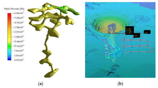 Some ant species, such as Atta vollenweideri leaf-cutting ants [64] and termites [4,72], build towers on the surface with a series of openings at the entrance/entrances of the nest to assist air to enter naturally into the underground opening, thus regulating the atmosphere and humidity in the underground tunnels and incubation chambers. In the work of Halboth and Roces [27], the ventilation circuit was experimentally tested using ventilation towers at the entrance of the nests of this ant species, where the effectiveness of CO2 removal was demonstrated, especially where there were high concentrations. Another research [73] on the ventilation of the nest of Camponotus japonicus Mayr ants was carried out by 3D imaging using the nest cast technique mentioned in Section 4.1. The digitized model was then entered into the finite element program, FLUENT, where the effect of air flow on the pressures and air flow rates within the nest was examined and based on the analyses, the environment within the nest was found to be constant throughout the nest (Figure 12a). This remarkable similarity is also seen in human mines, where the system of access and ventilation works to assist the air circulation underground. For example, Figure 12b shows the ventilation circuit in the diamond mine in Diavik, which was designed with the Ventsim program [74].