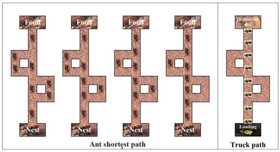 - The carriers transferring the food to the nest can be associated with trucks transporting the mined material from the mine to the deposit position. It should be noted that transport follows the opposite path in mining operations than ants’ movement from the operation (nest) to the deposition site (food source), as the goal of ants is storage, while in mining operations, it is extraction. Further, in large-scale mining, the fleet of trucks resembles the swarm of ants as they march from and to the nest.