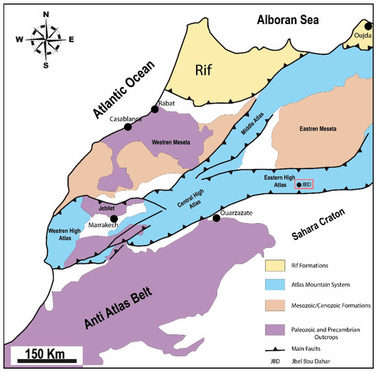 The JBD study area is situated within the eastern part of the High Atlas Mountains, renowned for its diverse geological record (Figure 1).
