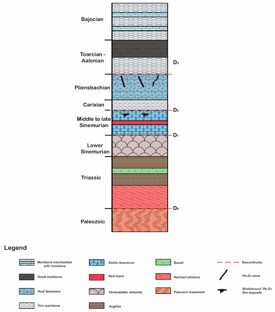 In the central part of the Bou Dahar fold, Paleozoic facies are prominently exposed, influenced by E–W and NE–SW trending faults, with local microgabbro dike intrusions likely of Triassic origin [17]. The Atlas system formation is attributed to an early Triassic rift, driven by Pangea fragmentation, resulting in a marginal sea formation [20]. Triassic sediments consist of red bed siltstone, evaporites, and tholeiitic basalts from the Central Atlantic Magmatic Province (CAMP) [16]. A westward Tethys transgression during the early Sinemurian to early Hettangian resulted in extensive carbonate deposits, notably the laminated stromatolitic dolomite [17,20,21]. Fault-block tectonics and uplift generated a horst and graben pattern, forming shallow marine carbonate platforms [20]. The subsequent Carixian age witnessed marlstone deposition [17], followed by the Domerian–Toarcian transition, leading to fault reactivation and platform fragmentation [16,17,20]. The Bajocian period saw sedimentary layer deposition composed of alternating marl and argillaceous limestone beds, indicating prevailing deep marine conditions [16,17]. The uplift and fault inversion are attributed to the Alpine orogeny [16,17].