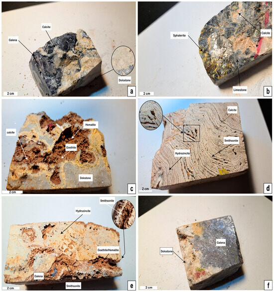 Hand specimens illustrating the characteristic features of sulfide and non-sulfide minerals in the Bou Dahar ore district: (a) galena, identified as patches; (b) sphalerite, occurring as massive patches; (c) iron oxide; (d) hydrozincite with smithsonite and calcite; (e) smithsonite as botryoidal aggregates and galena as euhedral crystals; (f) galena in massive forms.