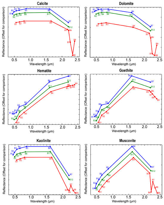 Spectral reflectance profiles of hematite, goethite, calcite, dolomite, muscovite, and kaolinite from the UGS Spectra Library, resampled according to ASTER (red line), Landsat-8 (blue line), and Sentinel-2 (green line) band ranges.