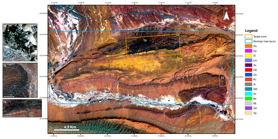 False-color composite (FCC) was used to enhance features of the objects in the images. In this research, the combination of SWIR, Red, and Blue bands was chosen to highlight the different lithological units and mineralogical zones by assigning specific colors to each one.