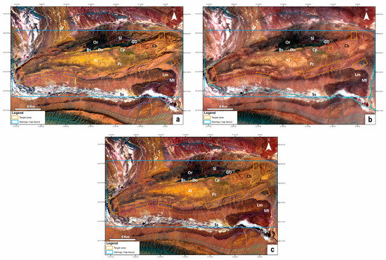 Regional representation of lithological units and mineralized zones using the RGB-FCC. Selected bands for the following: (a) Sentinel-2 image (R: band 11; G: band 4; B: band 2); (b) ASTER image (R: band 4; G: band 2; B: band 1); (c) Landsat-8 image (R: band 7; G: band 4; B: band 2). Active mine locations are delineated within target zones.