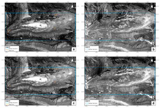 In the Sentinel-2 image, the areas in the Al unit, Cp unit, and regions near mineralized veins and galleries showed a high concentration of iron oxide minerals (target zone) (Figure 10a). On the other hand, PC5 showed a strong positive loading in band 12 (0.6804) and a moderate to strong negative loading in band 11 (−0.5972), suggesting the presence of OH-bearing and carbonate minerals, represented as dark pixels, inverted to bright pixels to better identify the minerals (Figure 10b). In particular, the Cb unit, Do unit, GD unit, Bs unit, Sl unit, and specific parts of the Al unit and Or unit highlighted a significant abundance of these minerals.