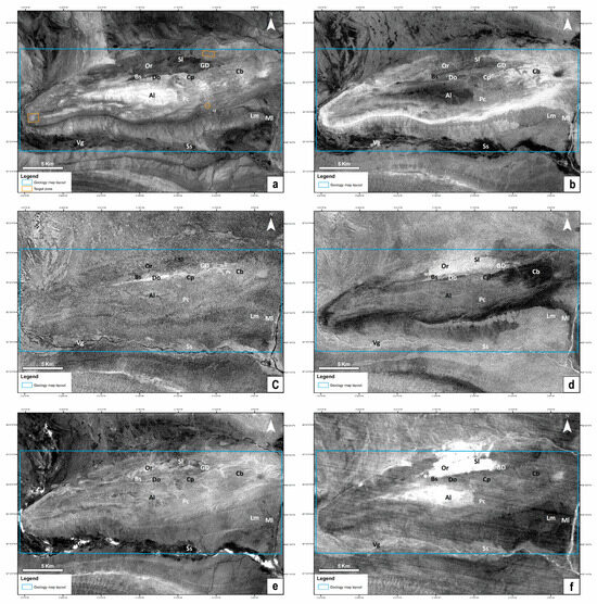 For the ASTER data, the presence of iron oxide is calculated using band ratio B2/B1. The resulting image shows the spatial distribution of iron oxide minerals, primarily concentrated in the Al and Cp units (Figure 9a). In comparison to the iron oxide maps by Sentinel-2 and Landsat-8, the ASTER image did not cover all zones rich in iron oxide minerals, particularly those near the extracted mineralized veins and surrounding galleries in the area. To individuate the carbonate minerals in the ASTER image, the band ratio (B7 + B9)/B8 is applied. This choice is based on the absorption feature observed around 2.30 to 2.35 µm, corresponding to B7 and B8. In Figure 9b, the bright pixels show a high concentration of carbonate minerals, while the darker pixels indicate a low concentration or absence of carbonate minerals. The high abundance of carbonate minerals is associated with the lithological units of Cb and Pc. To identify zones dominated by dolomite, the band ratio (B6 + B8)/B7 is applied. The dolomite absorption feature is primarily concentrated around 2.20 to 2.30 µm coinciding with B6 and B7 in the ASTER data. The Do unit is marked by bright pixels due to the high content of dolomite in this unit (Figure 9c). OH-bearing minerals show an absorption feature at 2.17 to 2.20 µm, corresponding to B5 and B6 in the ASTER data. The band ratio (B5 + B7)/B6 is applied to discriminate the OH-bearing minerals in the study area. Figure 9d shows significant concentrations of OH-bearing minerals highlighted by bright pixels in specific geological units, notably within the Or unit, Sl unit, Bs unit, and GD unit. The presence of OH-bearing minerals is also detected in other areas such as the Lm unit, Ml unit, and Ss unit. Vegetation shows the absorption features in the blue and red regions, coinciding with B2 (0.63–0.69 µm), and high reflectance in the NIR region equivalent to B3 (0.78–0.86 µm) in ASTER. Therefore, the band ratio B3/B2 is used for the discrimination and classification of vegetation (Vg), where bright pixels denote its presence (Figure 9e). Additionally, for the TIR bands in the ASTER data, the band ratio B14/B12 is applied to identify and classify quartz, which is typically associated with the Or, Sl, Bs, and Al units (Figure 9f). Comparing the BR results for the three sensors, the ASTER data highlight a good reliability in discriminating the spatial distribution of carbonate and OH-bearing minerals. On the other hand, iron oxide minerals are well identified by Sentinel-2 and Landsat-8 sensors.