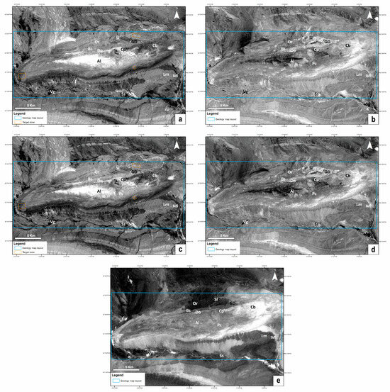 Maps derived from PCA, highlighting iron oxide minerals, OH-bearing minerals, and carbonate minerals as bright pixels: (a) PC4 image from Sentinel-2 illustrating iron oxide minerals; (b) PC5 image from Sentinel-2 displaying OH-bearing minerals and carbonate minerals; (c) PC4 image from Landsat-8 highlighting iron oxide minerals; (d) PC5 image from Landsat-8 showing OH-bearing minerals and carbonate minerals; (e) PC3 image from ASTER with the spatial distribution of carbonate minerals.