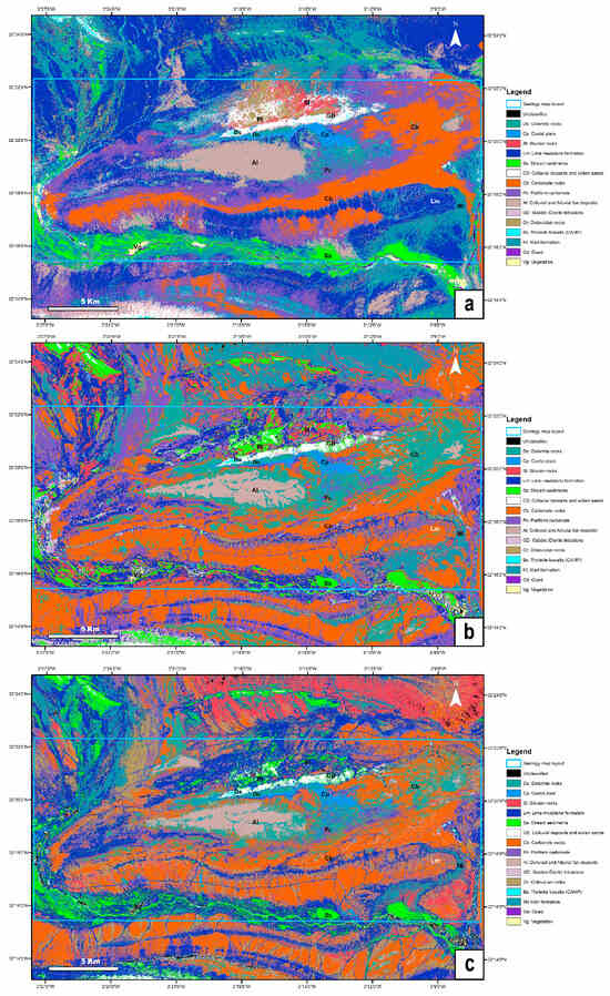 To evaluate the mapping accuracies of the datasets (ASTER, Sentinel-2, Landsat-8) by SAM classification, the confusion matrices were computed using a pixel-by-pixel comparison. These matrices offered valuable insights into the spatial distribution of classification errors (Figure 11). For the ASTER data, a detailed examination of the confusion matrix (Table 7) highlighted that the Ss and Al units showed the highest user’s and producer’s accuracies, both recording 100%. This result suggested that the SAM algorithm correctly classified the Al and Ss units. The GD unit had the lowest user’s accuracy (32.26%), showing a higher level of spectral mixing and confusion with the Pc and Or units. These results indicated lower spectral mixing and confusion among different classes, leading to a more accurate classification map for the ASTER image (Figure 11a). The confusion matrix of Landsat-8 (Table 8) showed the highest user’s and producer’s accuracies of 100% for the CE, Al, Bs, and Od units, whereas the lowest user’s accuracy of 22.73% was observed for Cb units. This observation implied that the Cb unit exhibited significant spectral mixing and confusion, particularly with the Pc unit (Figure 11b). For Sentinel-2 (Table 9), the highest user’s and producer’s accuracies of 100% were recorded for the Bs and Ss units, while the lowest user’s accuracy of 5.08% was associated with the Do unit. This result suggested that the Do unit highlighted substantial spectral mixing and confusion, particularly with the Cp and Pc units (Figure 11c).