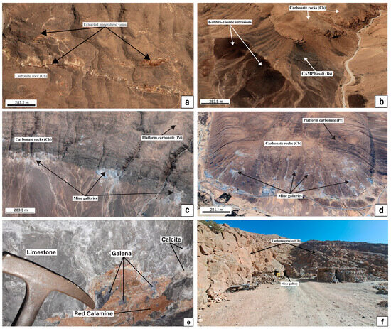 High-resolution GeoEye images from Google Earth (a,b,c,d) showing the extracted mineralized veins, carbonate rocks, gabbro–diorite intrusions and CAMP basalts; and field pictures (e,f) detailing the presence of some minerals in the study area.