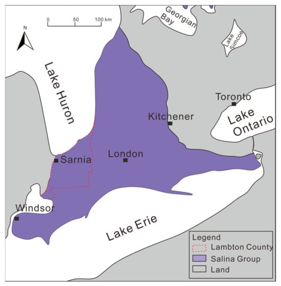 Lambton is situated within the tectonically stable interior of the North American Craton on the southeastern margin of the bowl-shaped Paleozoic Michigan Basin in Southern Ontario, Canada (Figure 3) []. The depositional environment of the Michigan Basin changed due to the horizontal and vertical loading being affected by the far-field tectonics associated with the Taconic and Acadian orogenies during the Paleozoic []. In the Upper Silurian, the Michigan Basin became a restricted marine basin that experienced extreme sea-level oscillations, leading to hypersaline conditions and the formation of the Salina Group []. During the Silurian Period, the Michigan Basin covered what are now parts of Michigan, Wisconsin, and Ontario.