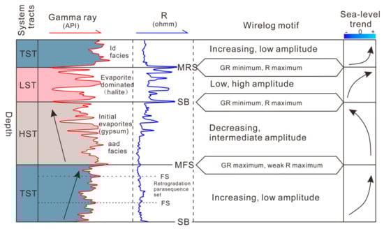 The log corresponding to evaporite sequence surfaces in the sequence stratigraphic model modified from []. TST: transgressive system tract, HST: high stand system tract, LST: low stand system tract, SB: shelf beak, MFS: maximum flooding surface, TS: transgression surface, FS: flooding surface. MRS: maximum regressive surface.