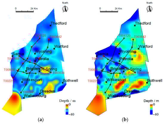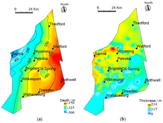 The burial depth of the B unit ranges from 160 to 480 m in Lambton, Southern Ontario (Figure 6a). The thicker salt rock is predominantly distributed in the western areas surrounding Watford, Oil Spring, and Wilikesport (Figure 6b), typically at depths below 250 m, with significant variations in thickness.
