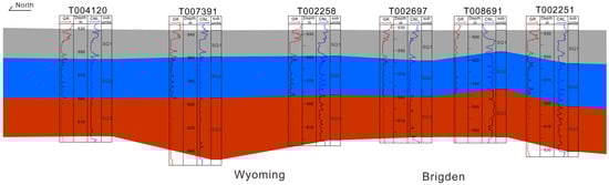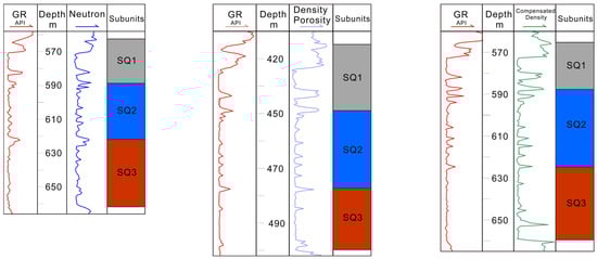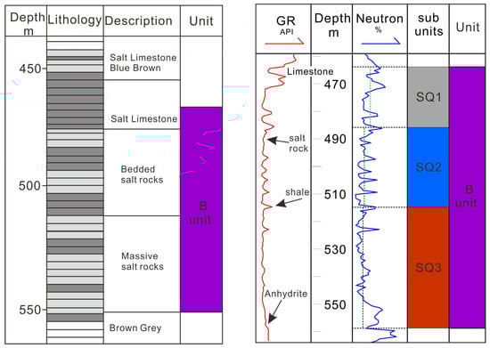 The lithology identification of internal units in this paper adopts the evaporite geological log analysis method of the Kansas Geological Survey, USA (Figure 4) []. The highly distinctive petrophysical properties of shale and evaporite make them easy to recognize on a standard log suite. Shale shows high natural radiation and porosity readings in logging data, while evaporite exhibits the opposite characteristics. Hydrogen storage-capable salt caverns can exclusively originate from halite within evaporite formations that is water-soluble. The types of the salt rock vary and are related to the sequence units [].
