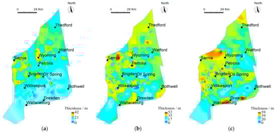 The thickness distribution of SQ1 mirrors that of the B unit, with the thicker sections in the northwest and thinner sections in the southeast (Figure 9a). SQ2 is widespread across the study area except for regions in Petrolia, Brigden, Dresden, and Bothwell (Figure 9b). The distribution of SQ3 is similar to that of SQ2, with thick sections found in the areas of Sarnia, Wyoming, Oil Spring, and Dresden (Figure 9c).