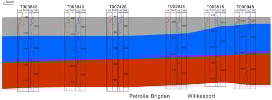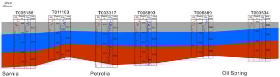 The A2 unit consists of salt rocks that contain carbonate rocks, which are not suitable for long-term storage [], while the B unit consists of salt rocks with an average thickness of 90 m and an average depth of around 400 m below the surface; the B unit has been considered the most promising option for UHS. However, due to the lack of geological characterization of the internal subunits and lateral variations in the thickness of the B unit in Lambton, there is a knowledge gap regarding the overall salt volume and its spatial variation for UHS.