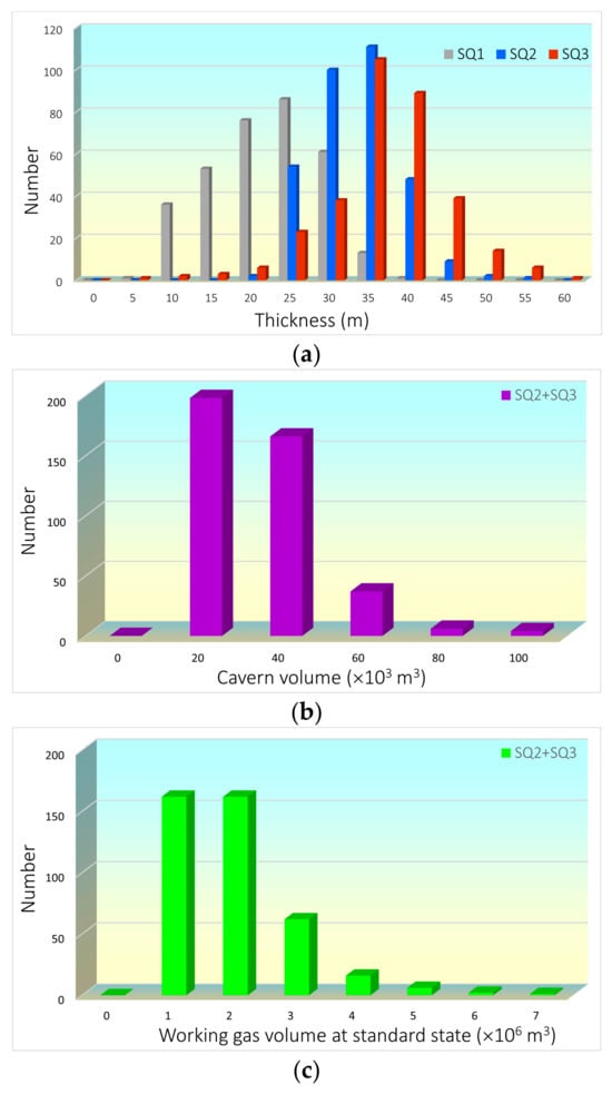 The potential of salt rocks for energy storage. (a) The thicknesses of the three subunits; (b) the volume of salt caverns in SQ2 and SQ3; (c) the working gas volume at the standard state in SQ2 and SQ3.