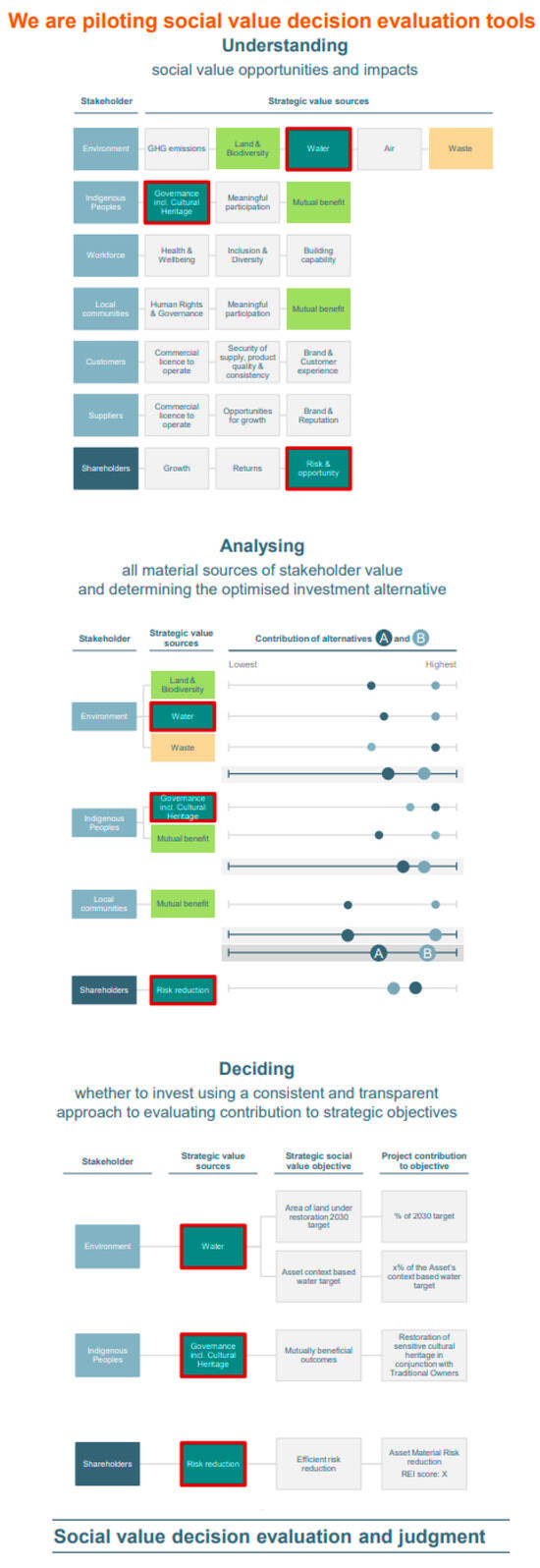 Some ‘S’ and ‘G’ variables can be quantified, but cannot be readily incorporated into the resource block model. These include Occupational Health and Wellbeing, Development and Training, Human Rights, and Commercial License to Operate. A unique category of ‘E’ and ‘G’ variables are not quantifiable and cannot be incorporated into the block model. These include Meaningful Inclusive Participation, Employee Engagement, Corporate Culture, Product Stewardship, and Trust.