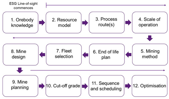 On the final step, optimization, decisions made in the previous process steps are reviewed and revised (12. Optimization). Sometimes, this is because new drill exploration information has enhanced the economically recoverable parts of the orebody. ESG line-of-sight commences with the resource model, and flows all the way through the design process.