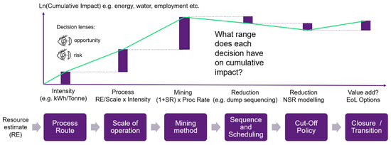 Mine planners are ideally able to aid the decision-making process by mapping the change/range associated with stakeholder priorities along the six key value drivers. Figure 5 shows the cumulative (logarithmic) impact of mine design decisions. The first three steps (Process Route, Scale, and Mining method) determine total cumulative impacts. The latter two processes, Sequencing and Cut-Off Grade optimization, can reduce impacts through smart design. For example, smart scheduling can reduce vertical lift required for waste dumps, thus reducing diesel consumption. Cut-off sequencing can incorporate penalty costs for certain geo-metallurgical characteristics (e.g., hardness, silica content, etc.) which can be factored into a Net Smelter Return optimization, designating some material too expensive to process.