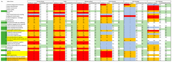 A mapping exercise was undertaken to understand which stakeholder priorities can be quantified and incorporated into the block model and which cannot. The process commenced with the identification of key stakeholders, in this case the eight key stakeholder groups highlighted previously. These eight key stakeholders were then identified as having thirty-one value drivers. The next step involved mapping the key levers as part of the strategic planning process against the 31 stakeholder values. The likelihood and impact of each design decision was evaluated against each of the 31 stakeholder value drivers on a Low (L), Medium-Low (ML), Medium (M), Medium-High (MH), and High (H) scale, as shown in Figure 6.