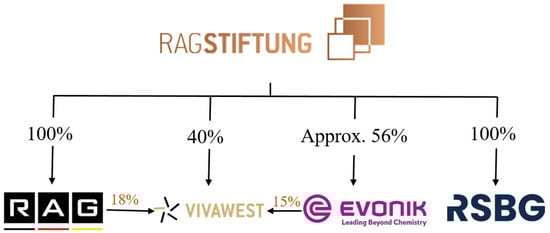 The income side of the foundation’s model is based in part on a mix of diversified capital investments with broad risk diversification, compromising shareholdings, government and corporate bonds, managed funds, and equity investments in medium-sized enterprises and real estate companies. However, the foundation generates most of its regular income with the help of its strategic equity investments in Evonik Industries AG, VIVAWEST Wohnen GmbH, and its holding company RSBG SE, as shown in Figure 2 [].