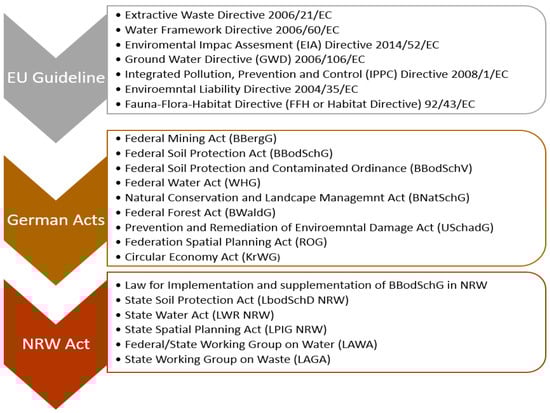Since there is no particular act on mine closure in Germany, the actual laws, regulations, and guidelines regarding mine closure and post-mining in the EU, Germany, and NRW are listed in Figure 4. The EU itself is neither a conventional international organization nor a federal state; it is a supranational organization of twenty-seven member states with its own integrated legal order, which means that the member states share responsibility with the EU for ensuring that EU laws are effectively and properly executed. The EU has the power to enact legislation binding all member states and has the mandate to enter into international agreements. A directive is a type of legislation that has to be implemented in the national legal orders of member states in such a manner as to guarantee that the objectives prescribed in it are attained in that state. Member states have a choice or discretion as to how this is ensured [,,].