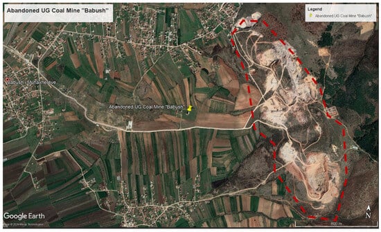 Abandoned coal mine of Babush in Kosovo in red dashed line (Google Earth Image, date: 2022).